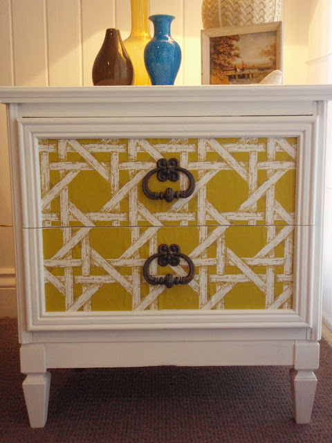 | Dressed up with beautiful vintage mustard and white lattice wallpaper. |